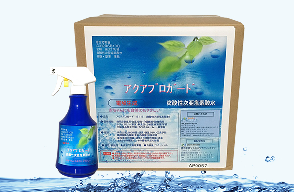 その機能は除菌力+消臭力+安心力。微酸性次亜塩素酸水アクアプロガードは日本の新技術によって最も水に近い性状で電気分解生成装置から生まれました。